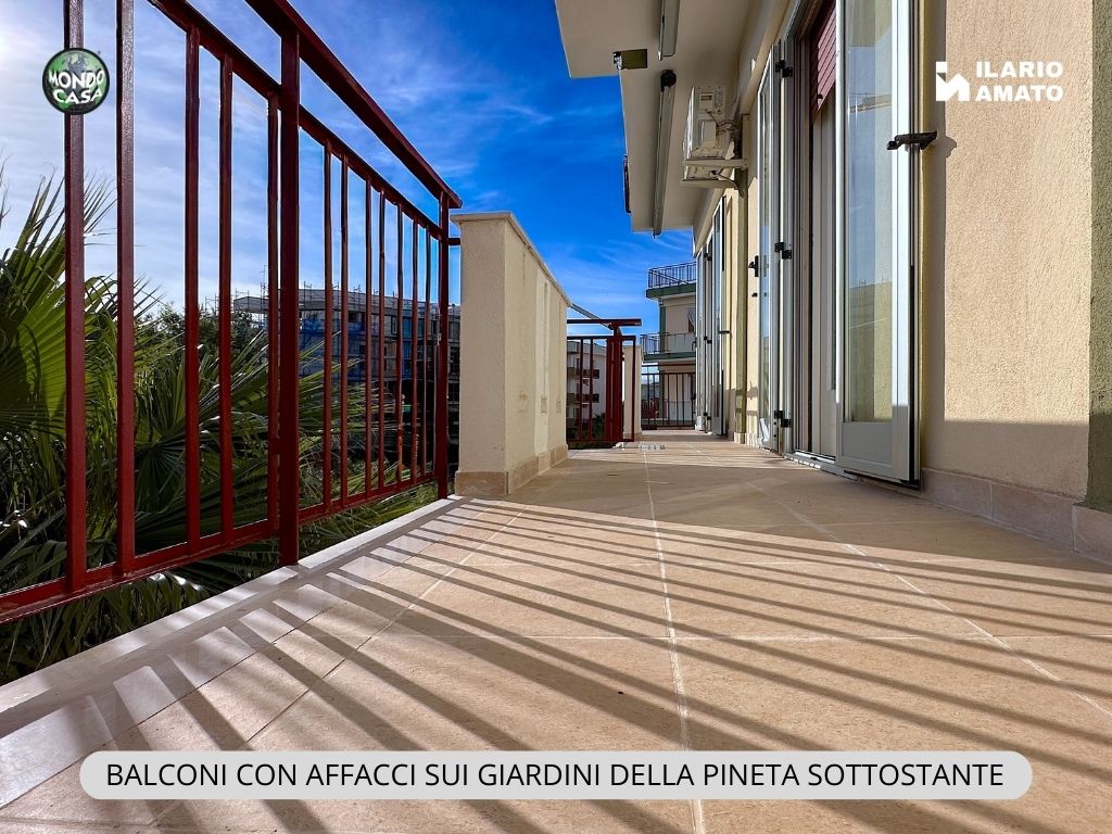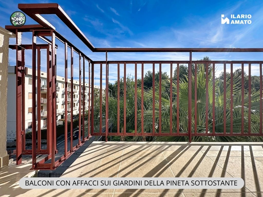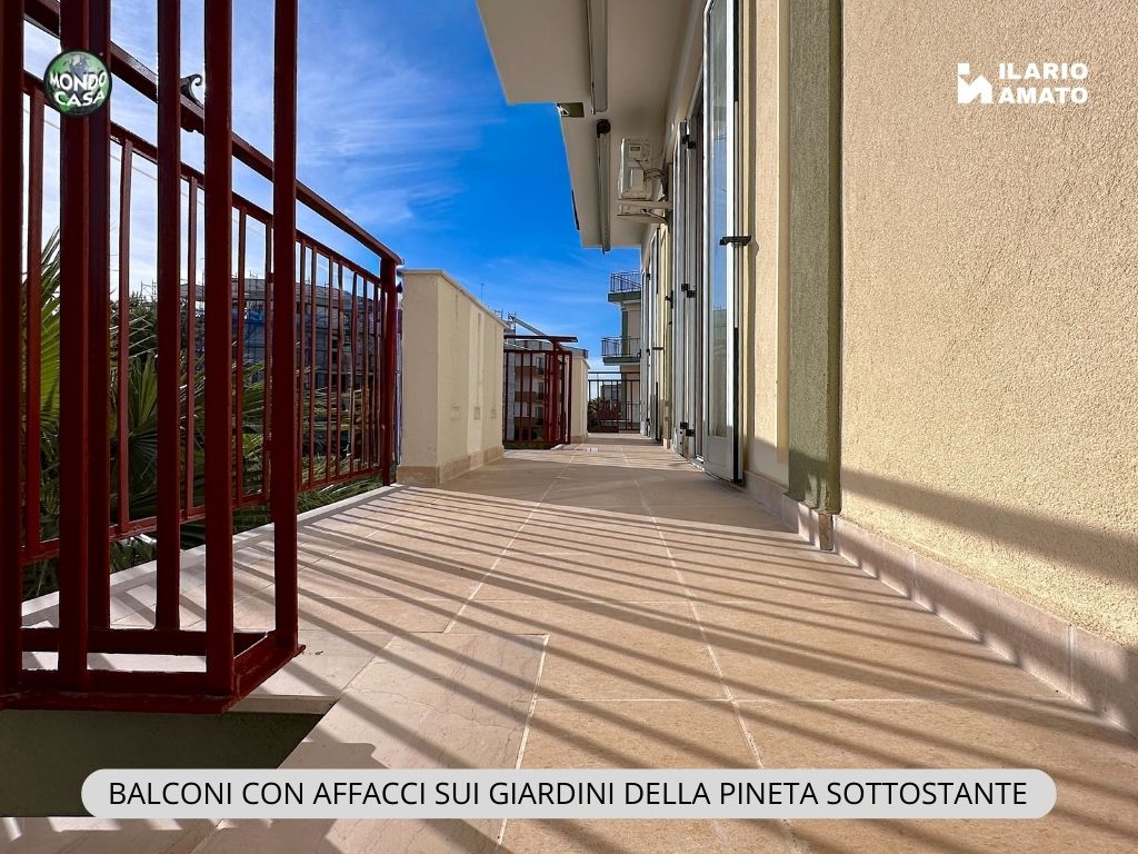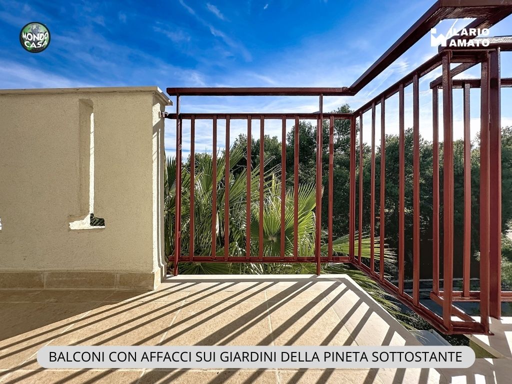 All’esterno, 26 mq di balconi completano la proprietà, mentre gli affacci regalano una gradevole vista mare laterale e un’esposizione diretta sui giardini della pineta sottostante.