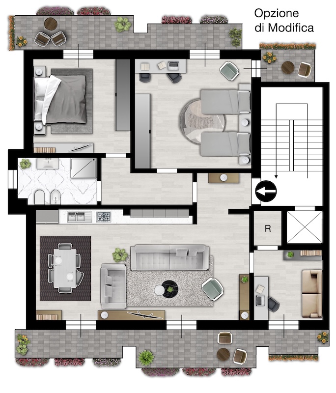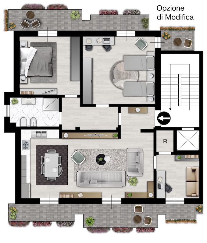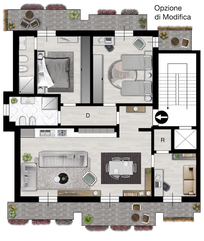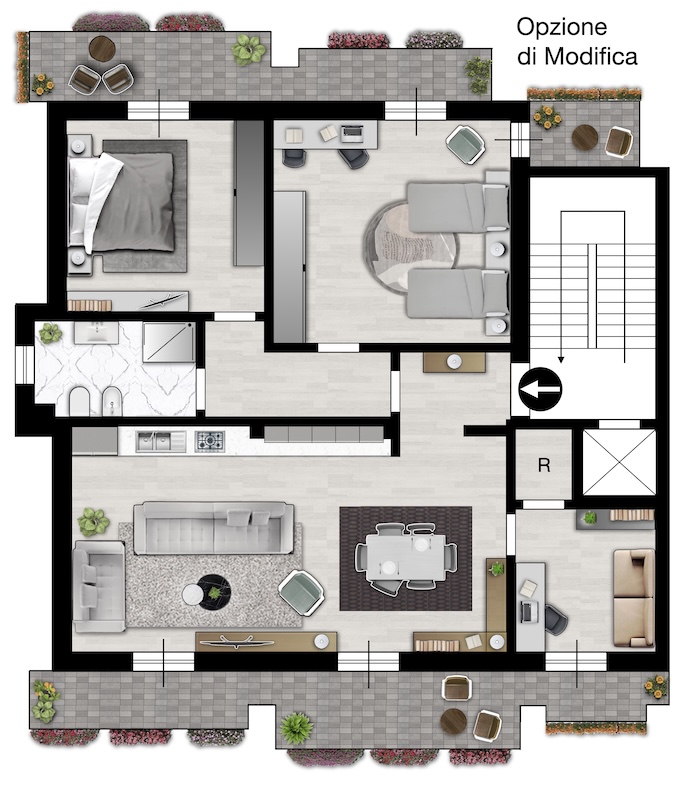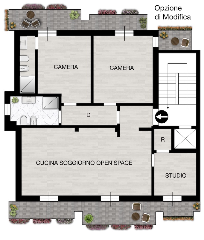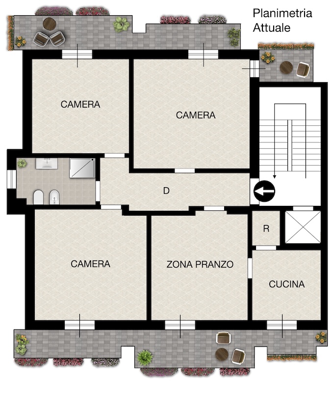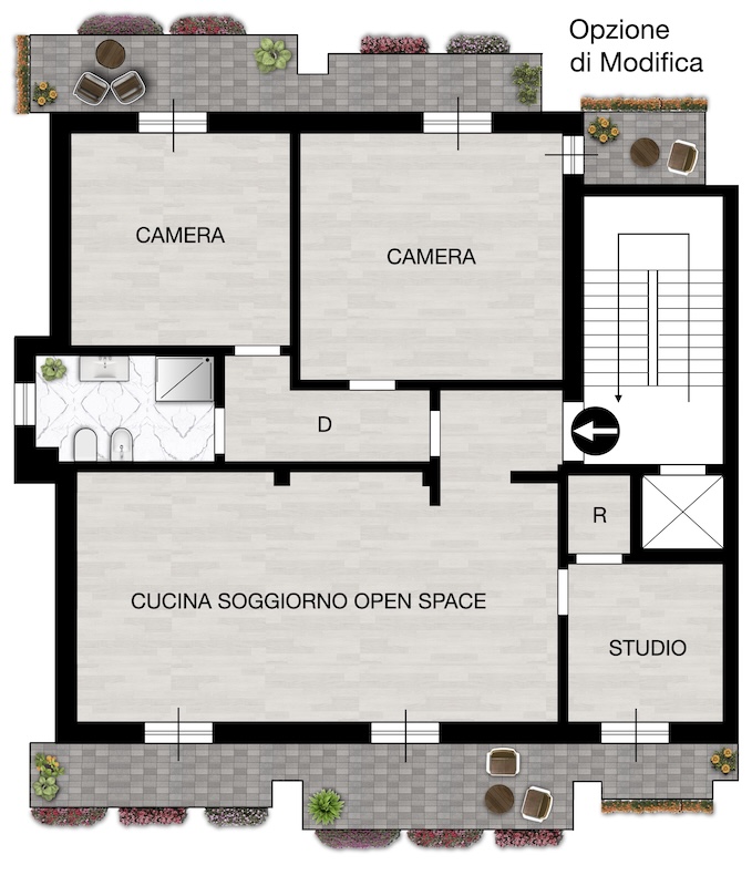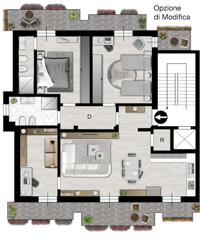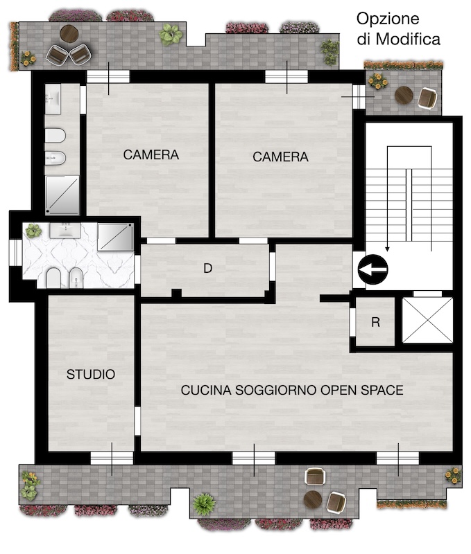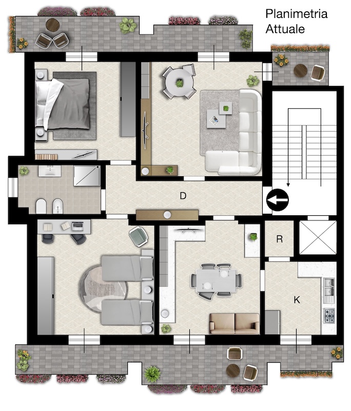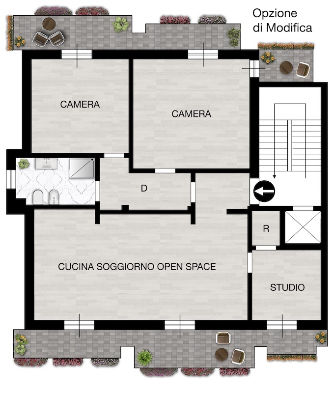 Ma il vero valore aggiunto è la versatilità: con semplici modifiche è possibile ridisegnare gli spazi e trasformarla in un appartamento moderno e funzionale. Proprio per questo abbiamo già predisposto 5 diverse soluzioni di progetto, capaci di adattarsi a gusti ed esigenze di tutti.