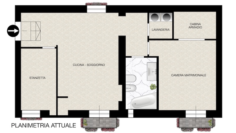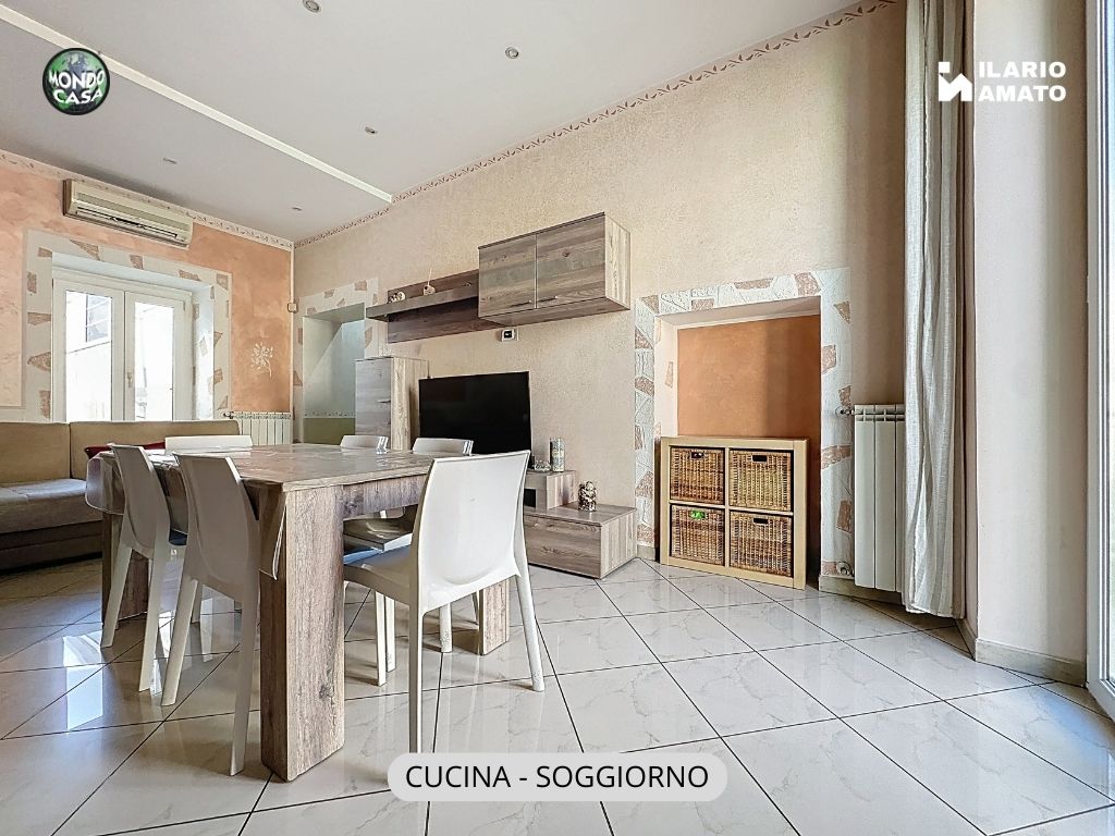 Internamente la casa sviluppa una superficie catastale di 82 mq, oltre a due balconi con esposizione su strada, che contribuiscono a rendere gli ambienti luminosi e ariosi.
