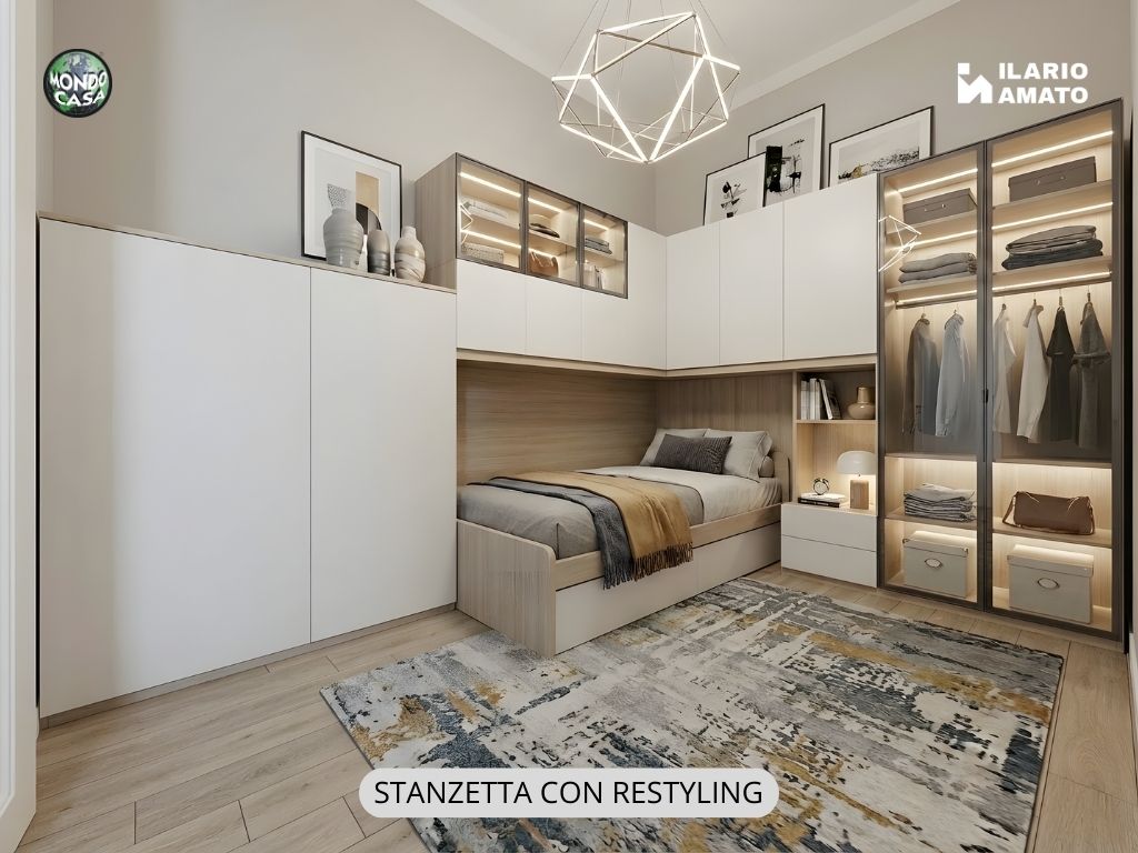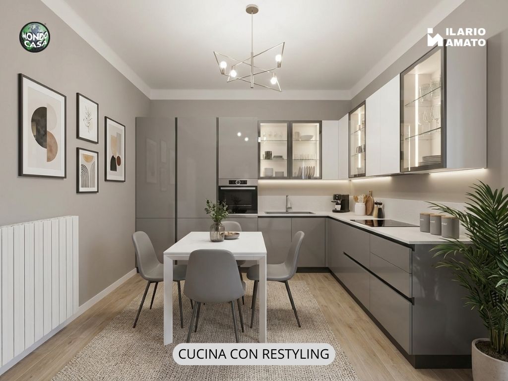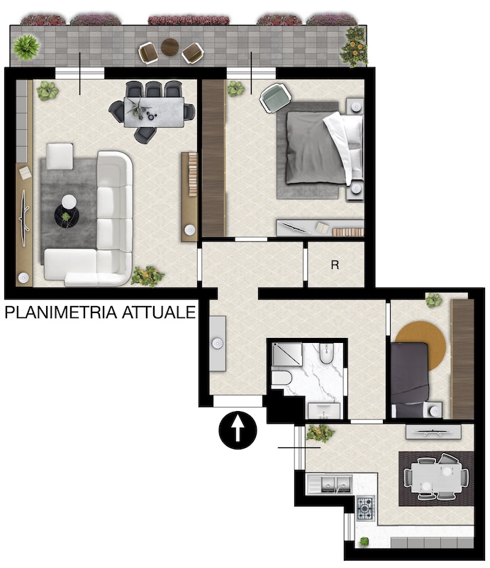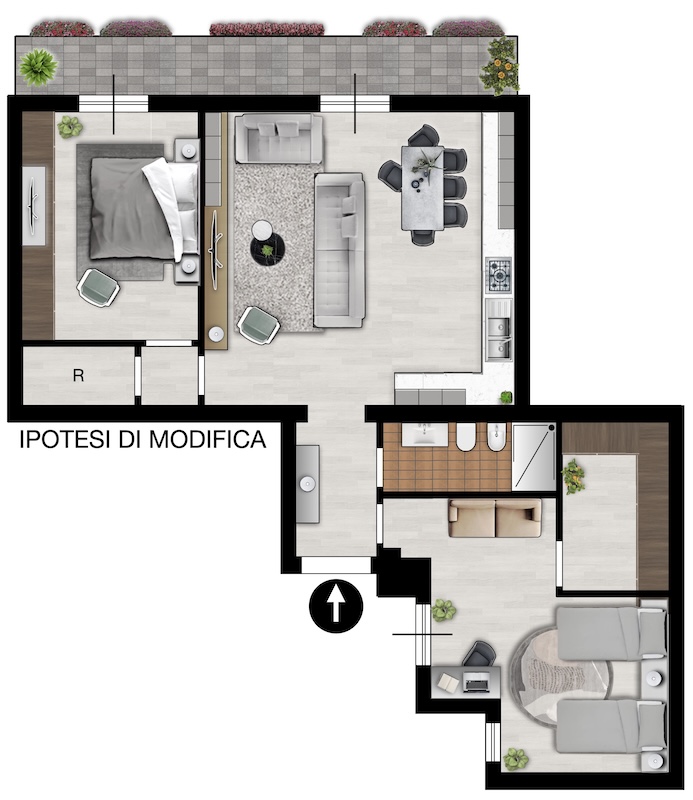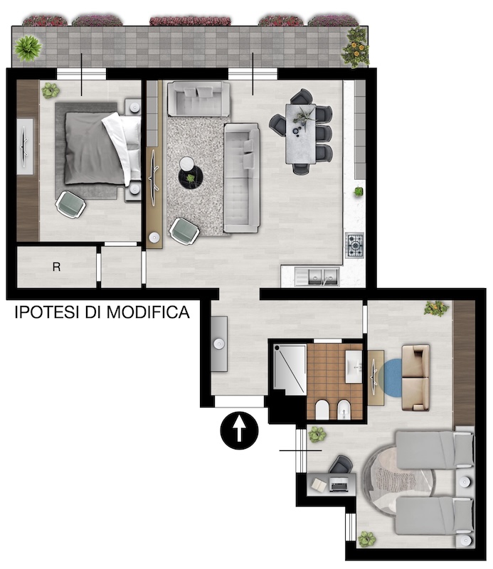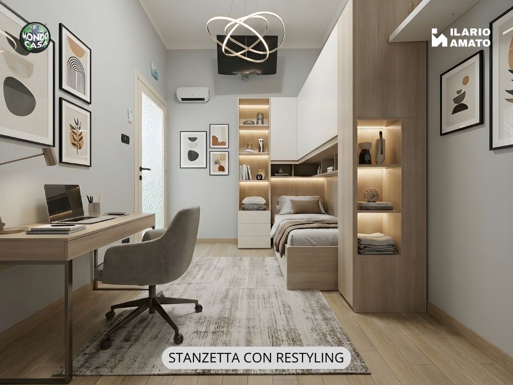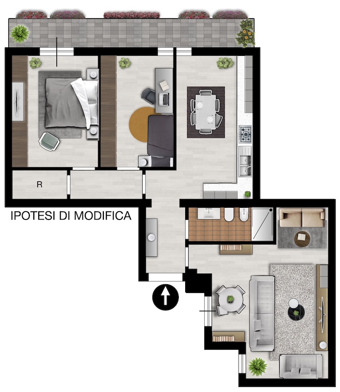 L’immobile presenta una doppia esposizione: esterna, con vista panoramica sul centro città, e un vano con affaccio interno sul pianerottolo. Attualmente l’immobile necessita di un intervento di rinnovamento o ristrutturazione e per valorizzarne al meglio il potenziale, sono state studiate tre diverse soluzioni di ridistribuzione interna, accompagnate da render con svariate ipotesi di arredo, che permettono di immaginare una casa più moderna, funzionale e in linea con le esigenze abitative attuali.