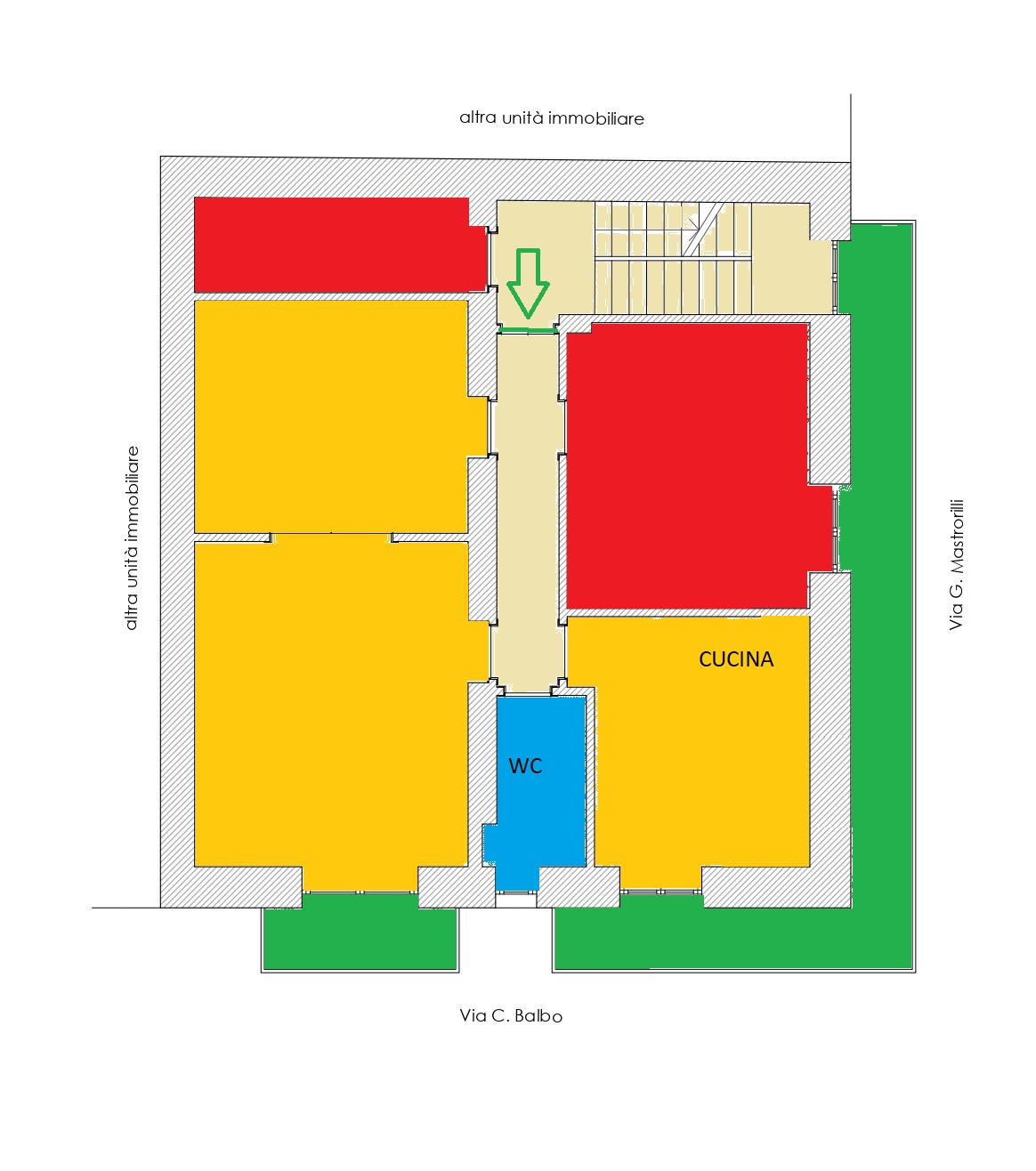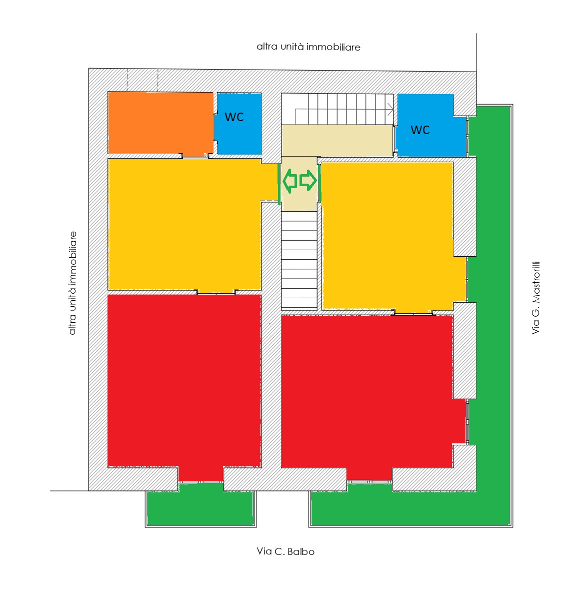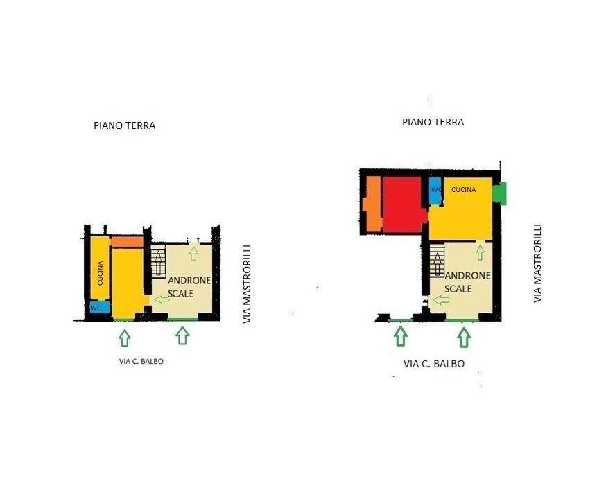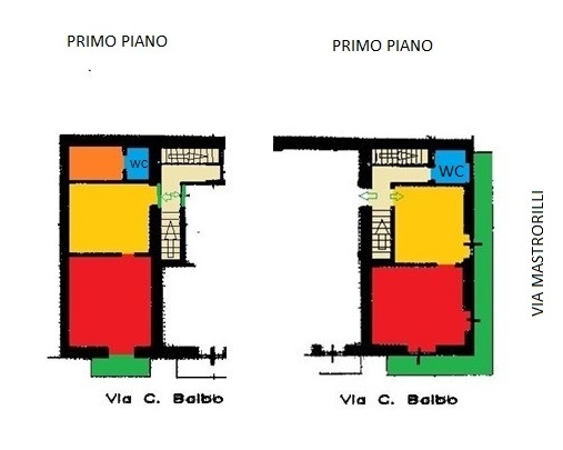- Piano terra: con ben due ingressi, uno dei quali accede nell'androne comune attraverso cui si passa ai piani superiori e l'altro a due bilocali muniti di servizi;