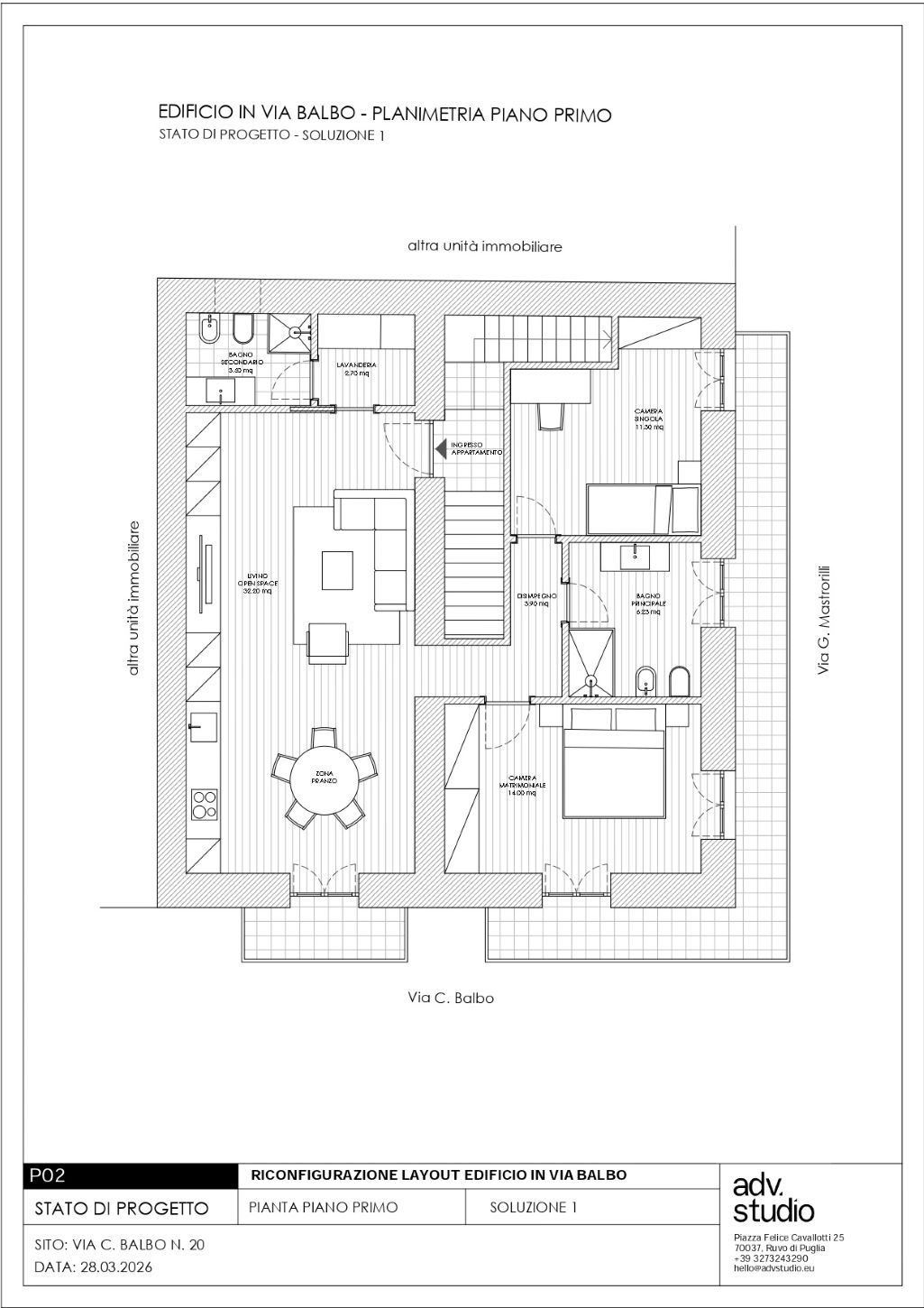 - Secondo piano: con un unico appartamento di tre vani e servizi;