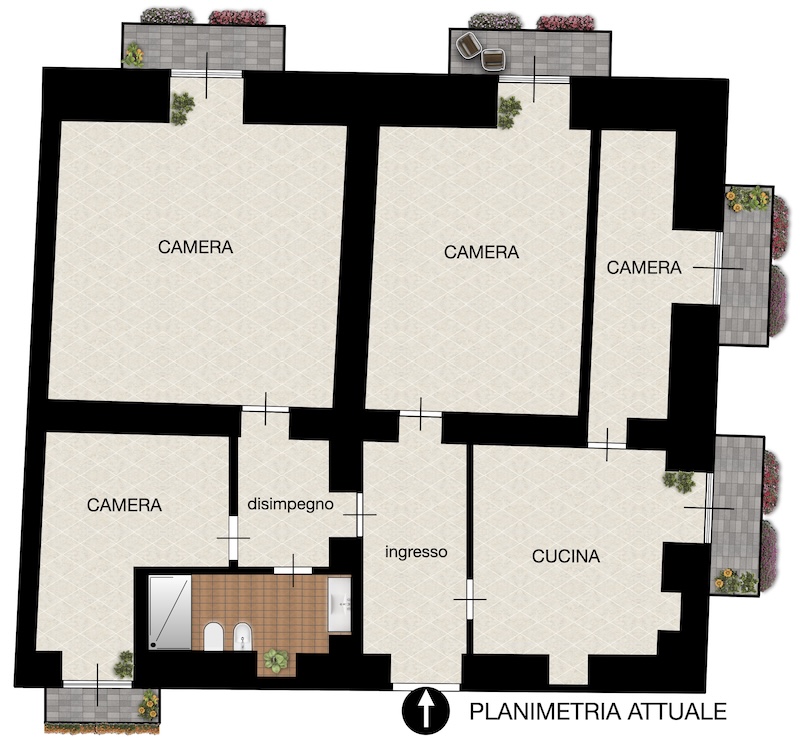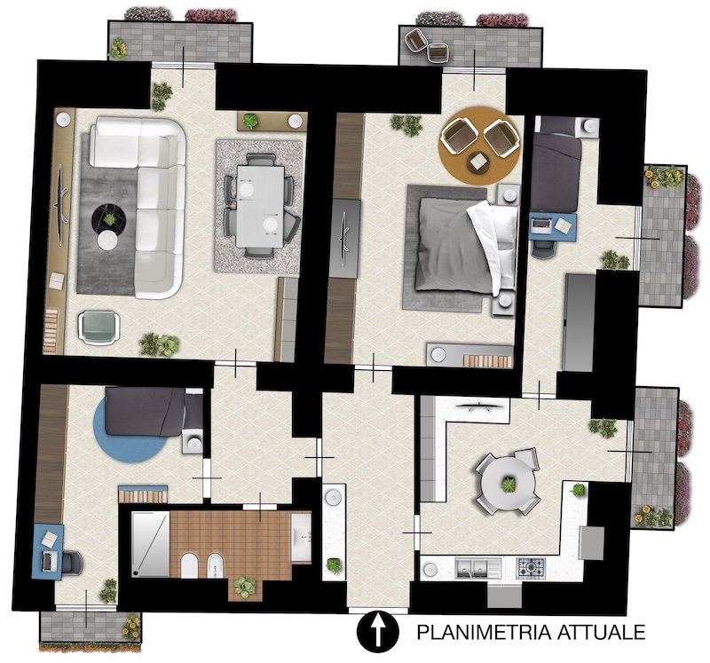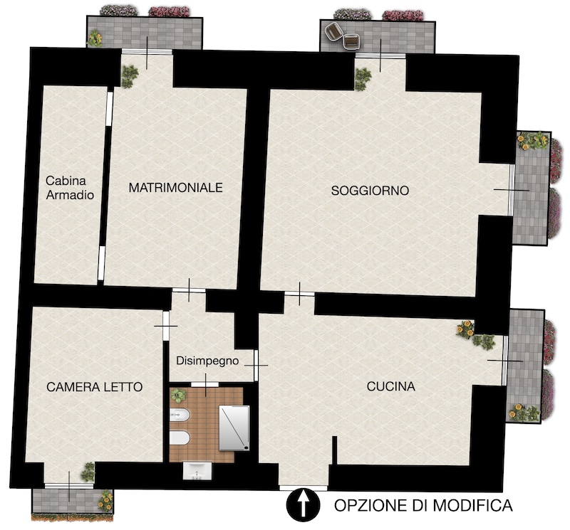 Inoltre, per chi desidera rinnovarla e renderla ancora più attuale, abbiamo già studiato un progetto di riorganizzazione degli spazi che, con pochi interventi, può trasformarla in un appartamento moderno e funzionale.