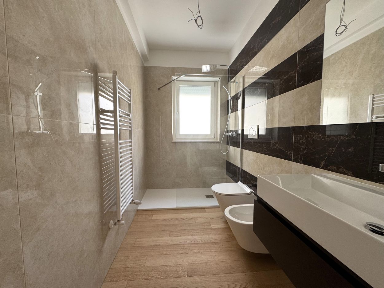 La zona notte è ben distribuita, con due camere da letto comode e versatili, perfette per una coppia, una piccola famiglia o anche per chi desidera avere uno studio in casa. Il bagno è moderno e ben rifinito, con materiali di qualità e uno stile contemporaneo.