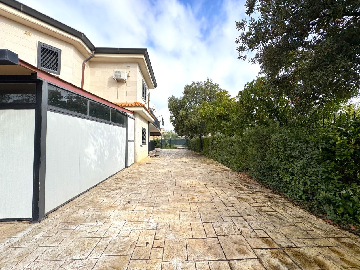 All’esterno colpisce subito la grande area pavimentata, perfetta per parcheggiare comodamente più auto, e il verde ben curato che incornicia la villa con eleganza.