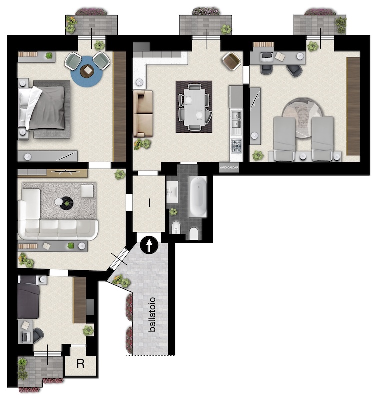 Tre balconi affacciano su via Tenente Marzocca, regalando una piacevole vista sui giardini della piazzetta di via Baccarini; l’ultimo si apre invece sulla corte interna, garantendo privacy e tranquillità.