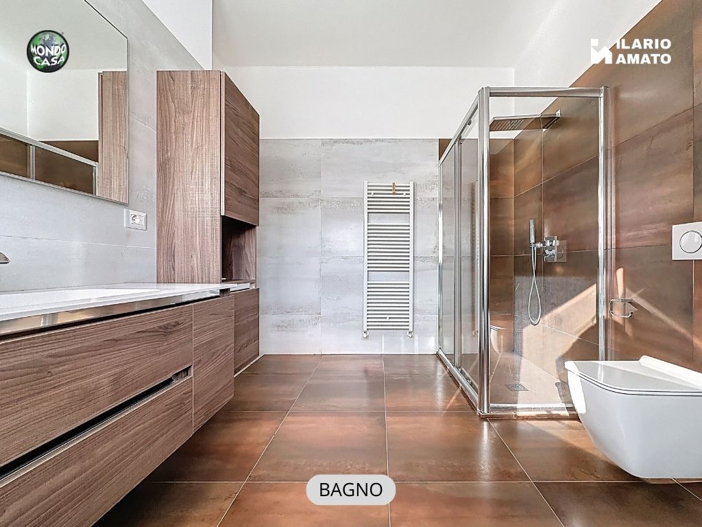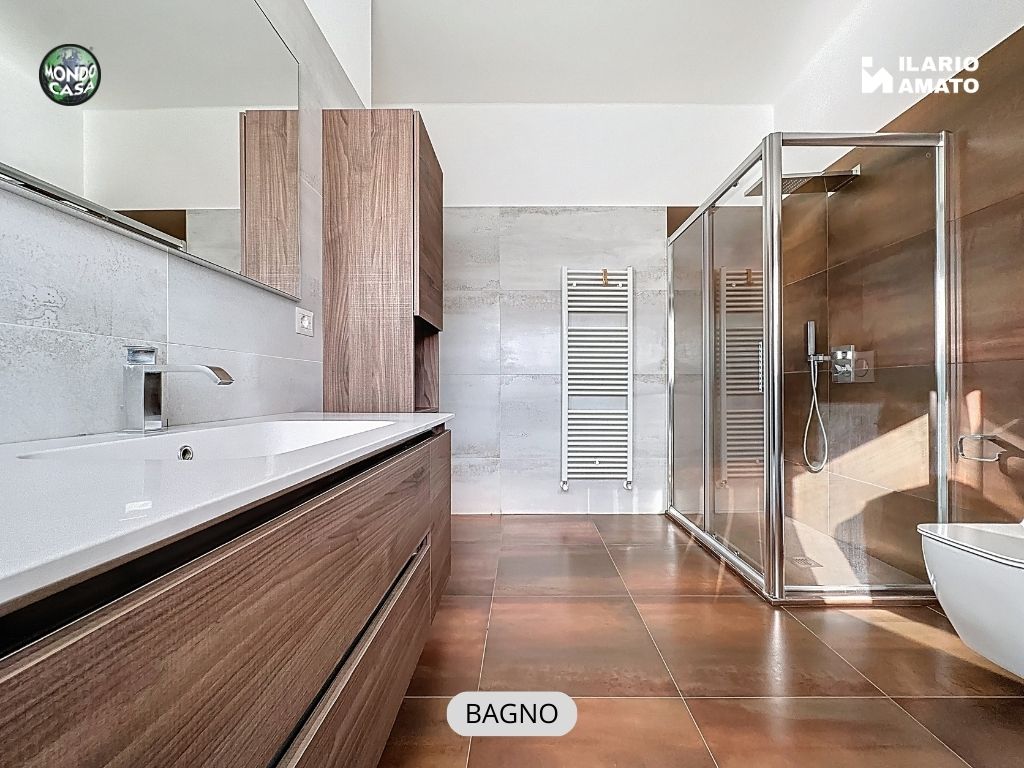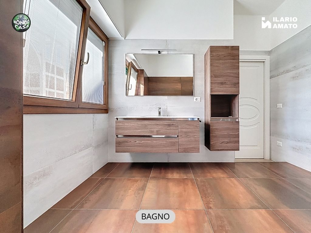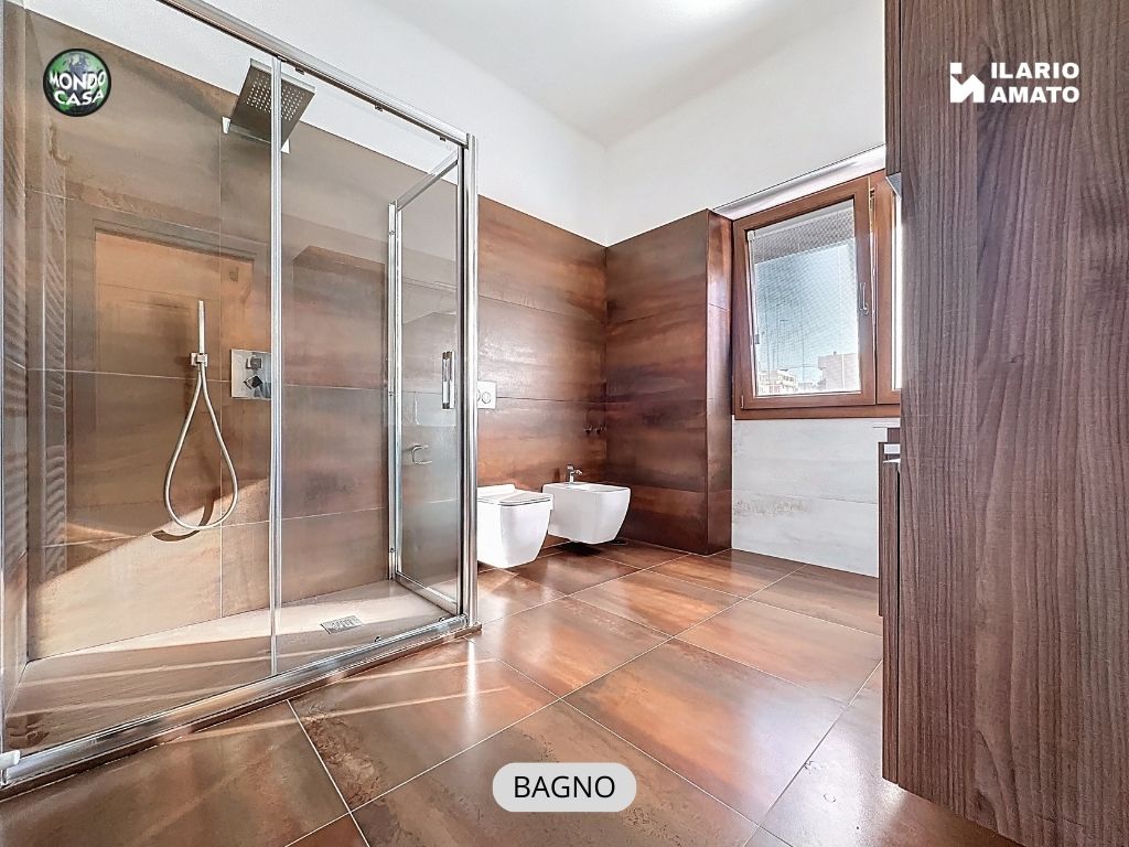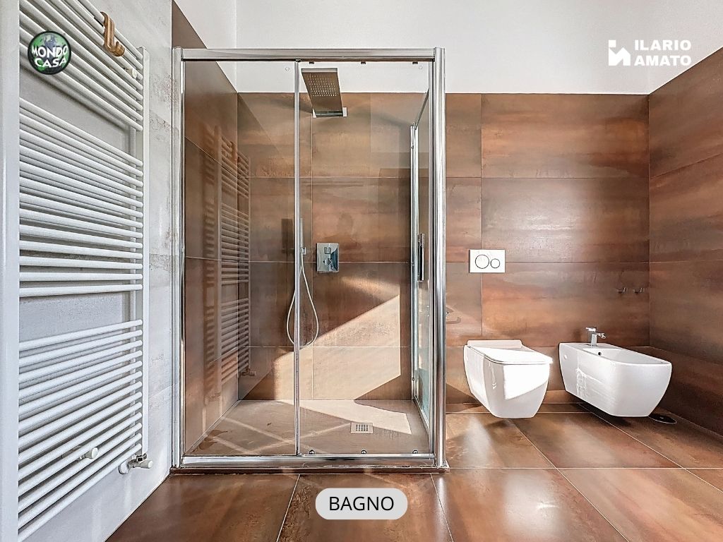 • bagno finestrato, moderno ed elegante, con gres effetto bronzo, piatto doccia in resina, sanitari sospesi e termoarredo,