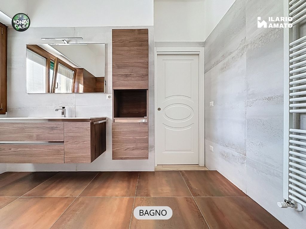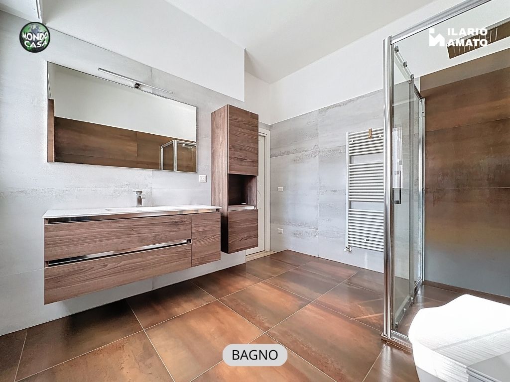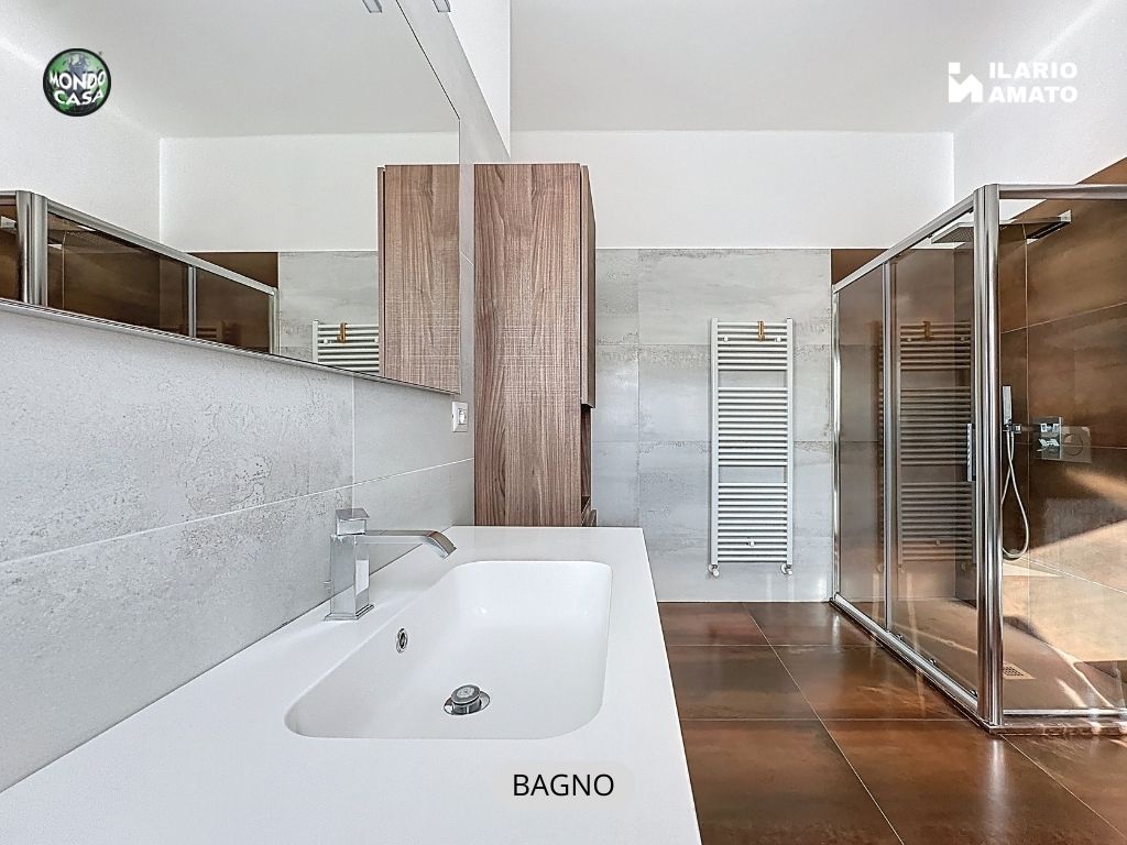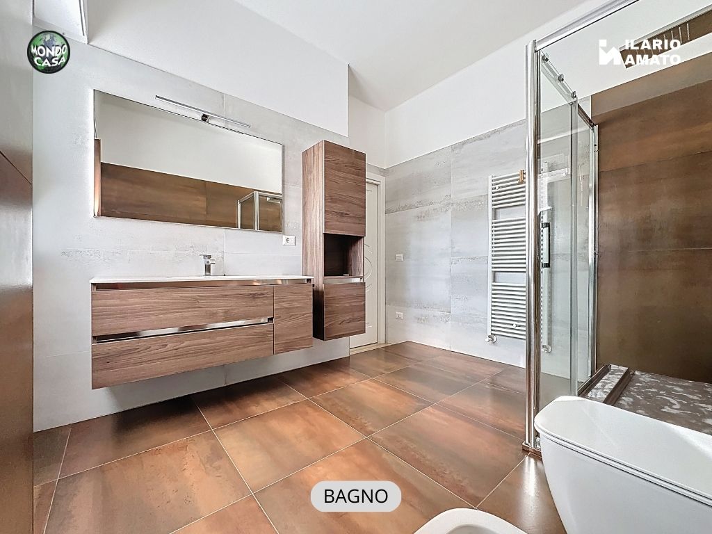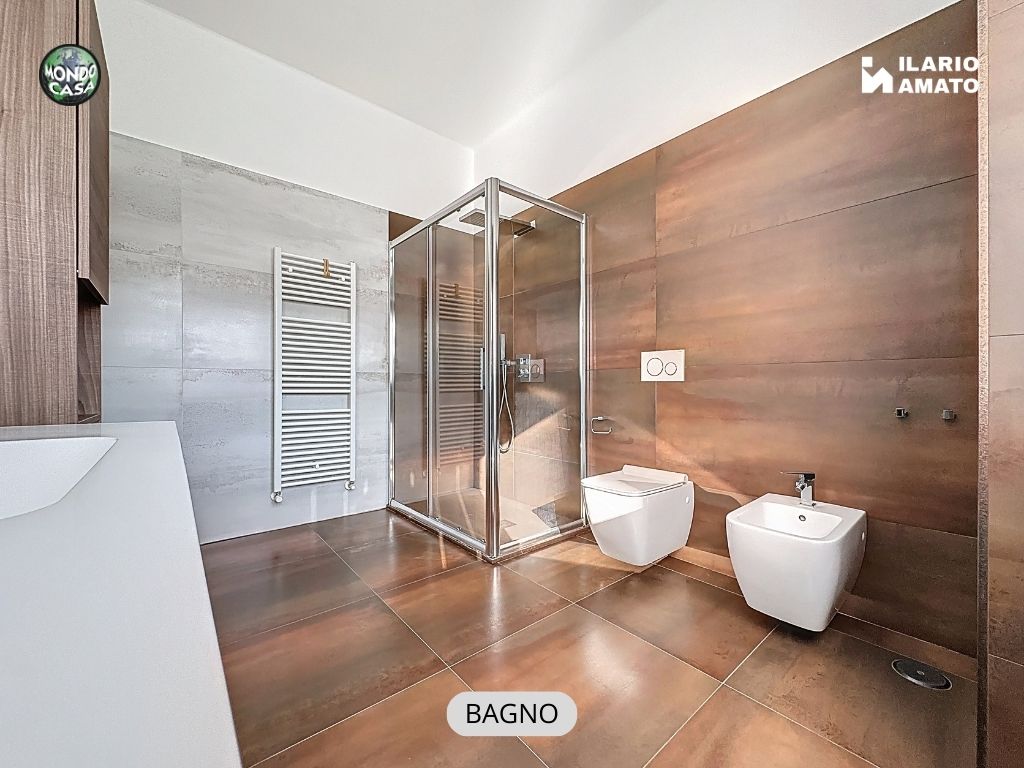 • bagno finestrato, moderno ed elegante, con gres effetto bronzo, piatto doccia in resina, sanitari sospesi e termoarredo,