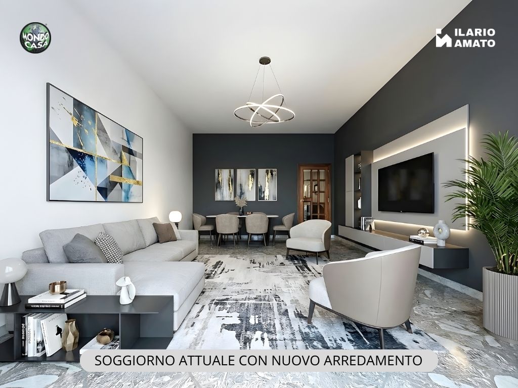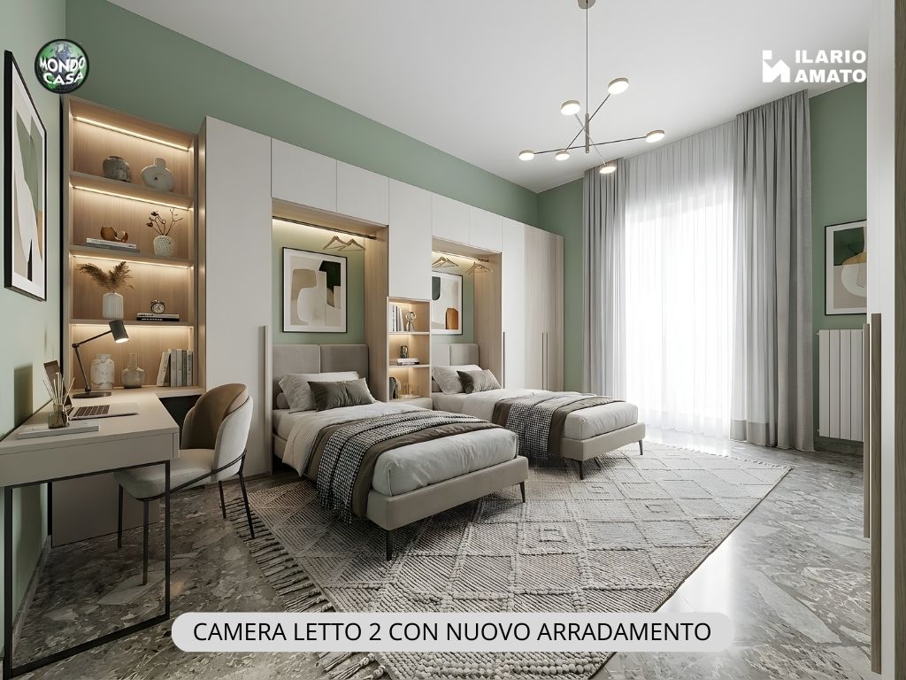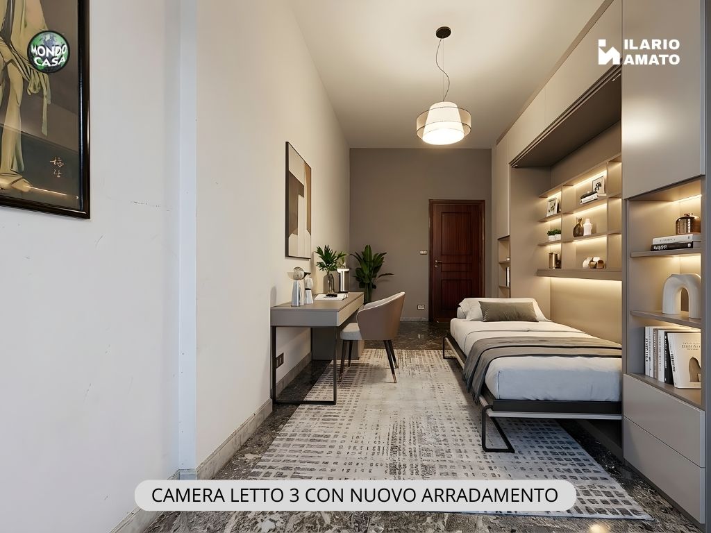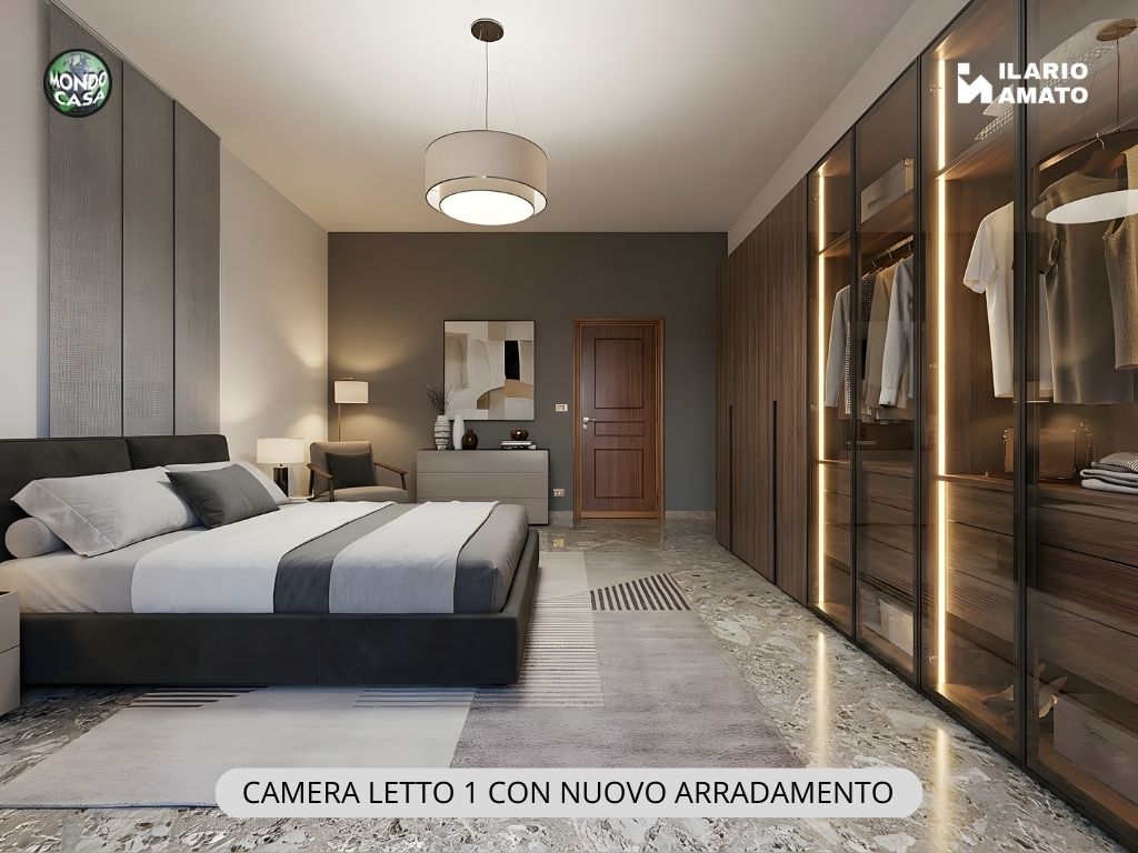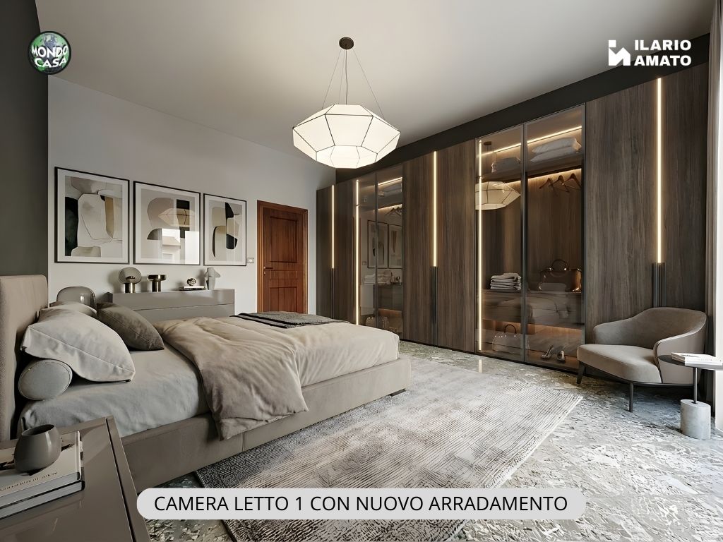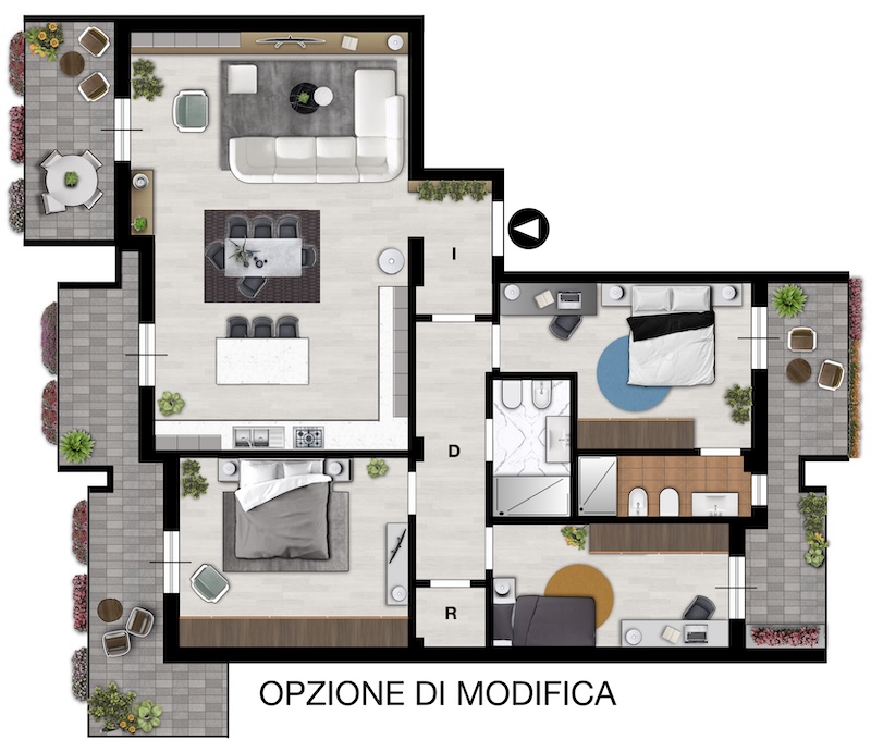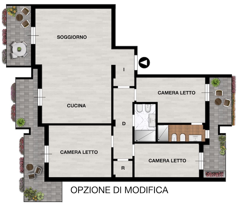 La distribuzione attuale è già funzionale e pronta da abitare; tuttavia, per chi desidera rinnovare, è disponibile una proposta progettuale alternativa con ampia zona living open space con cucina a vista e soggiorno, tre camere matrimoniali, doppi servizi (uno in camera) e ripostiglio, realizzabile con interventi leggeri.